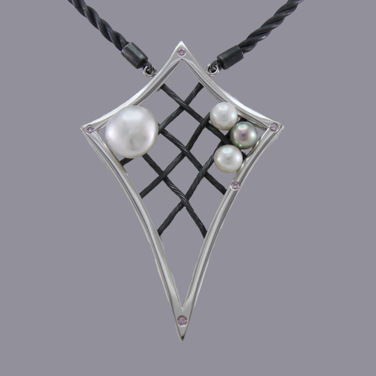 The oxidised Sterling silver, in the pendant body, twisted into runs of ‘twine’, represents the netting material used to make the Pearl growing nets. The larger, longer ‘rope’ forming the necklace attached to the pendant, signifies the ‘Long lines’. These lines, suspended by buoys, are used on the surface of the bays of the pearl farms, that these cages hang from whilst the pearls grow.